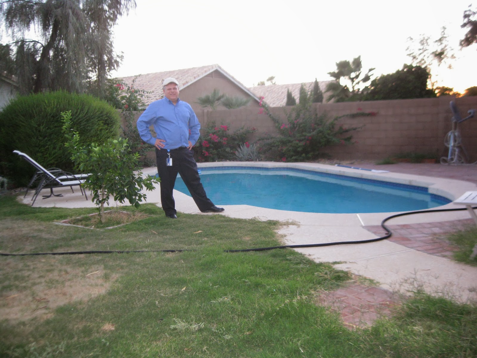 Yup, a two car garage and a pool! Here are the pre-purchase pictures of the place. It doesn't look quite as good now - the flowers along the sides of the house had to be removed to treat for TERMITES (turns out there are two kinds of houses here - those that have 'em and those that will have 'em). Plus of course, now my sparse furniture is in here... Well, I bought some of what was here, so new pictures might show some familiar scenes.